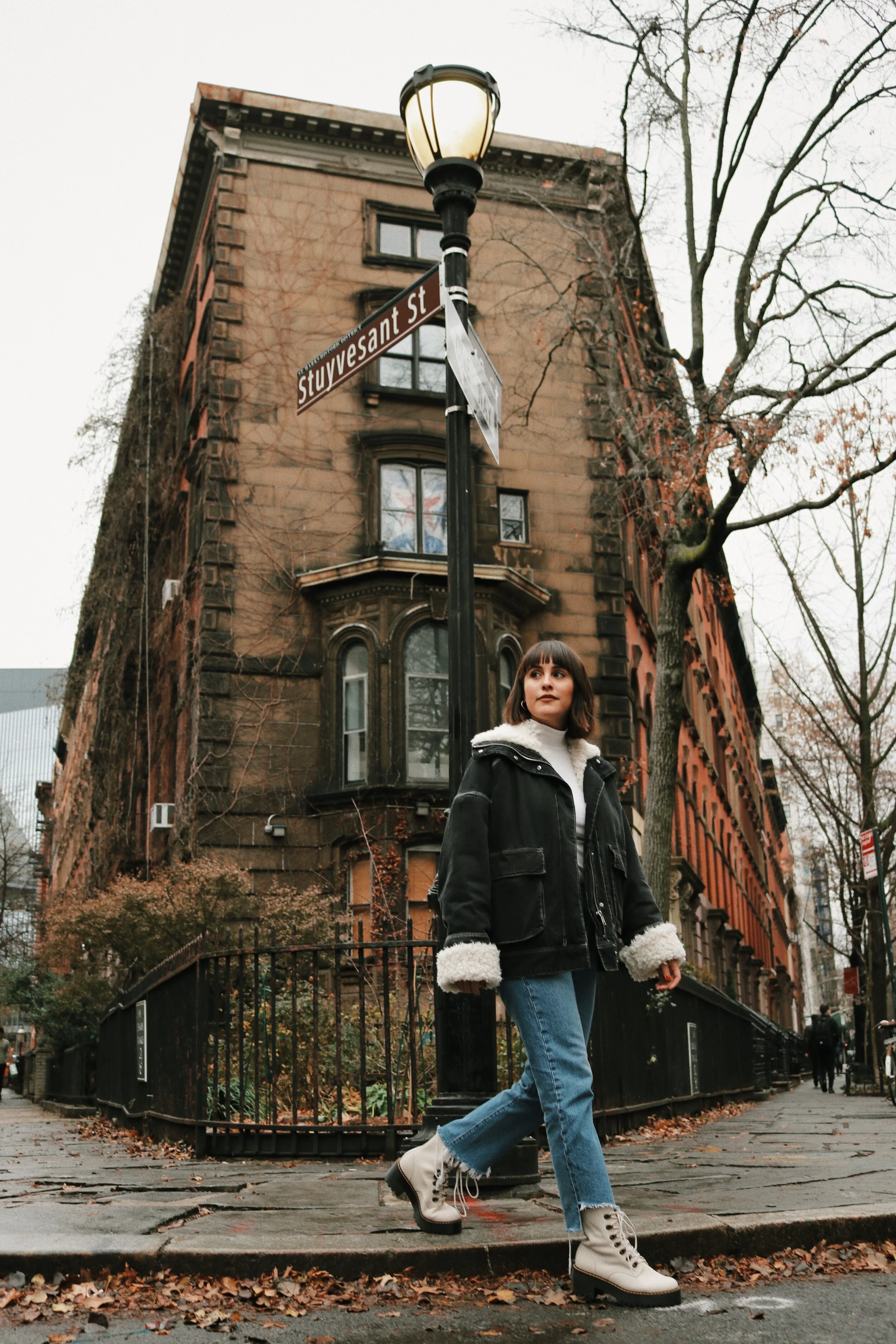 East Village Dec 15 Written By Maritza Almendaro Wearing & Other Stories Oversized Denim Sherpa Jacket, Levis 501 Uneven Hem Denim, Doc Martens Leona Boot. Maritza Almendaro